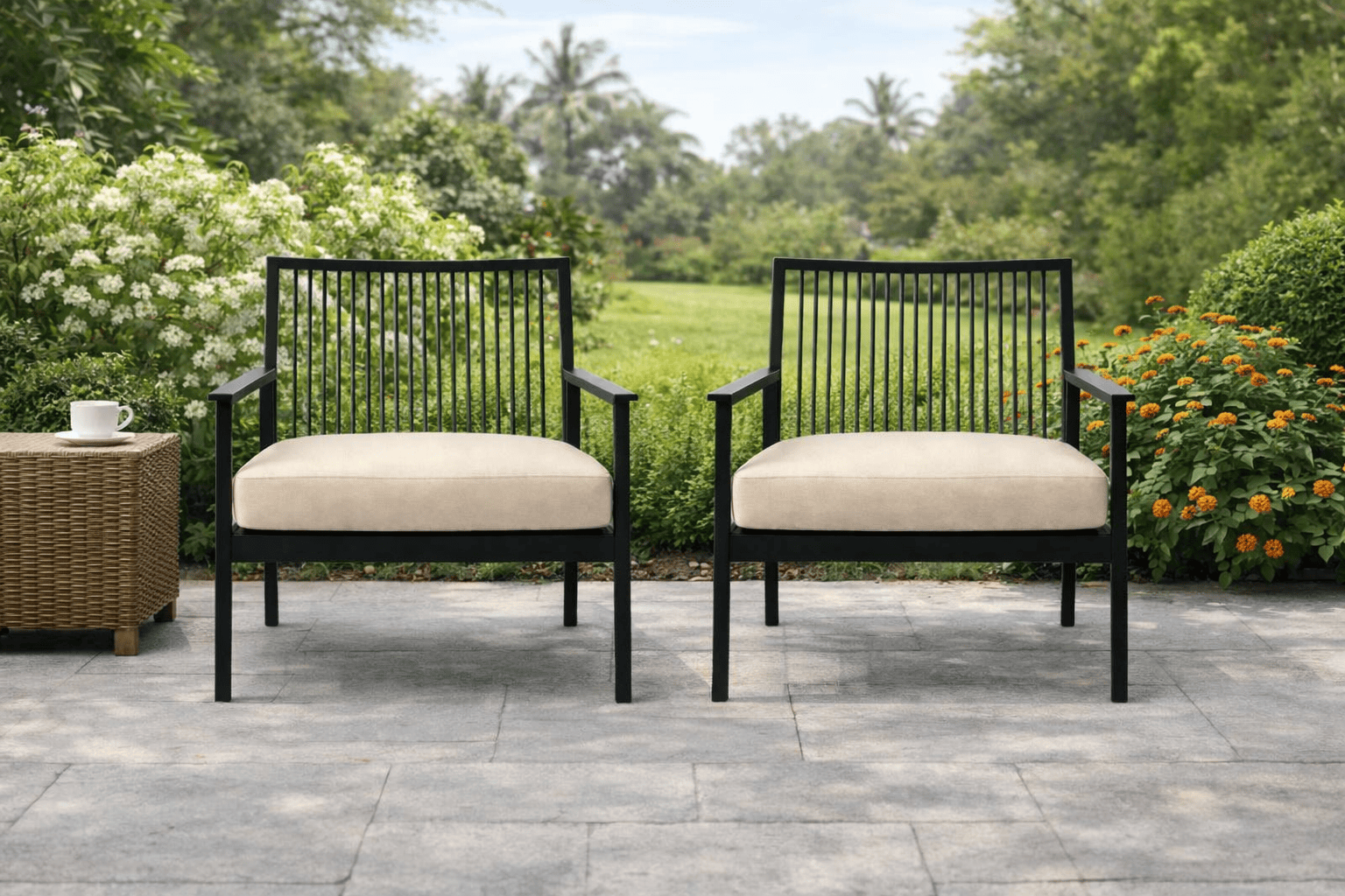 Wooden Outdoor Armchair Set with Rattan and Fabric Cushions